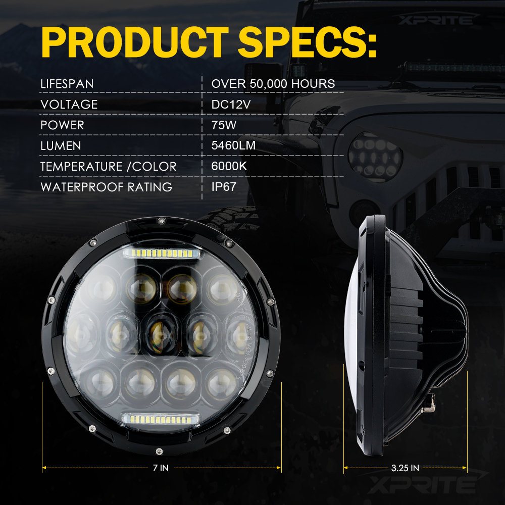 | Incluye | One Pair of Xprite 7″ 75W CREE LED Headlights With DRL For 1997-2018 Jeep Wrangler |